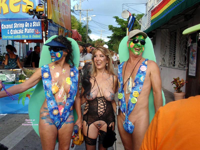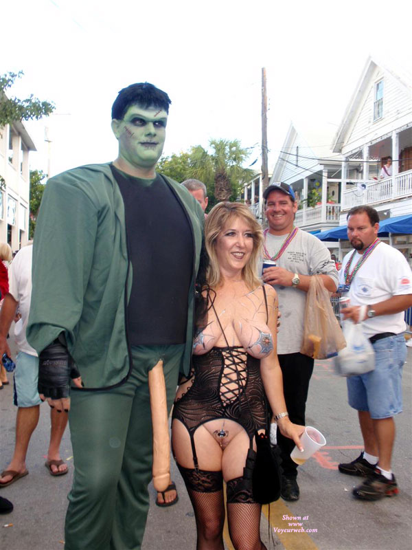 We went to Fantasy Fest this year and I really was hoping that my wife would expose herself for the day, actually 2 days. I was blown away when she wore these costumes which completely showed her pussy. I was in heaven as 1000's of onlookers took pictures. It really was exhilarating as we strolled down Deval Street. Oh by the way...The local police were busting girls with full frontal nudity so we had to sneak past the cops many times during the day and evening. We got away with it so I hope you all enjoy and get vicarious pleasure through our naughtiness!!!